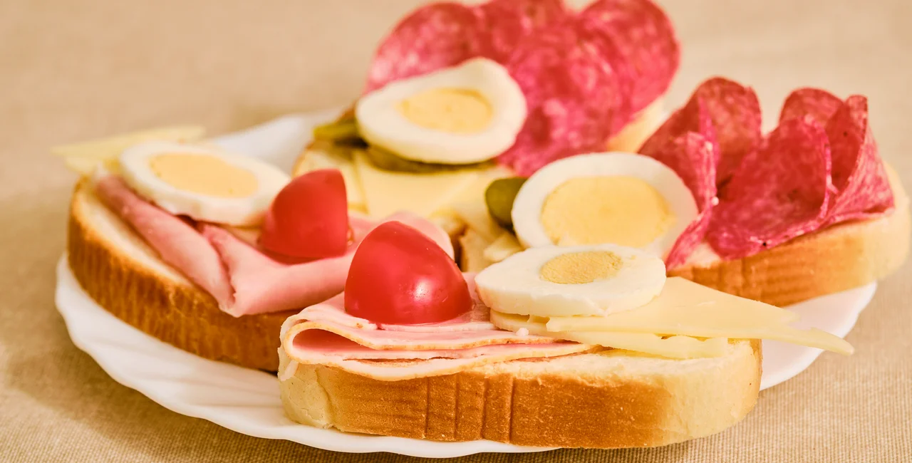 The bread is sliced at an angle, to make a wide area to cover with toppings. The bread slice is then covered on top with butter or mayonnaise, and then toppings such as egg, pickles, salami, cheese, seafood salad, or vegetables are added. There are no fixed recipes. People can decorate the chlebíčky according to their own imagination.