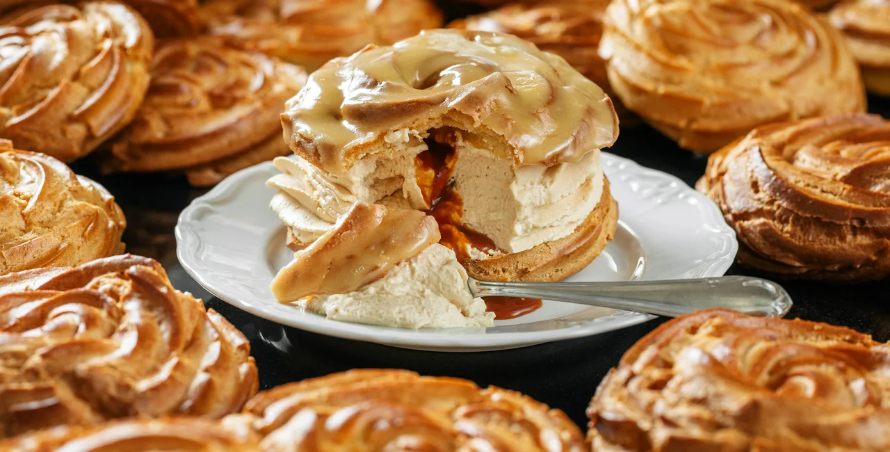 Větrník is one of the more sizeable desserts you can find in Czech pastry shops. The confection consists of two halves of choux pastry, joined together with yolk cream and caramel whipped cream, with the top half coated in caramel fondant. At the Myšák confectionery, they take the Větrník to the next level by adding salted caramel filling, making it a heavenly indulgence.