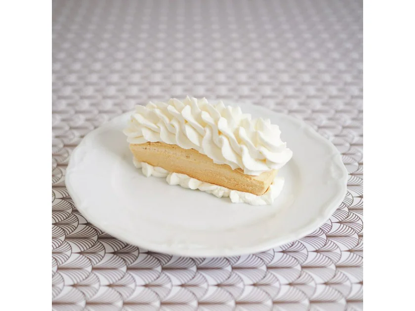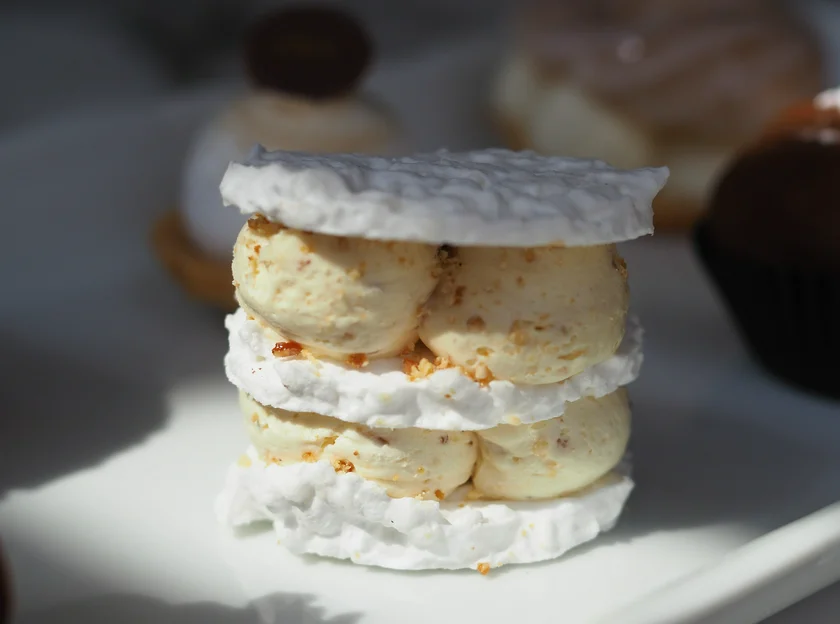 Laskonka is a Czech confection that's similar to a macaroon. It's made from tender coconut-flavored meringue and consists of two halves that are typically joined together using different cream varieties such as chocolate, nuts, caramel, or coffee, commonly found in pastry shops. At Myšák, you can try laskonka with a filling of buttercream and griliáš (a mixture of caramelized sugar and hazelnut powder) in both the regular and double versions.