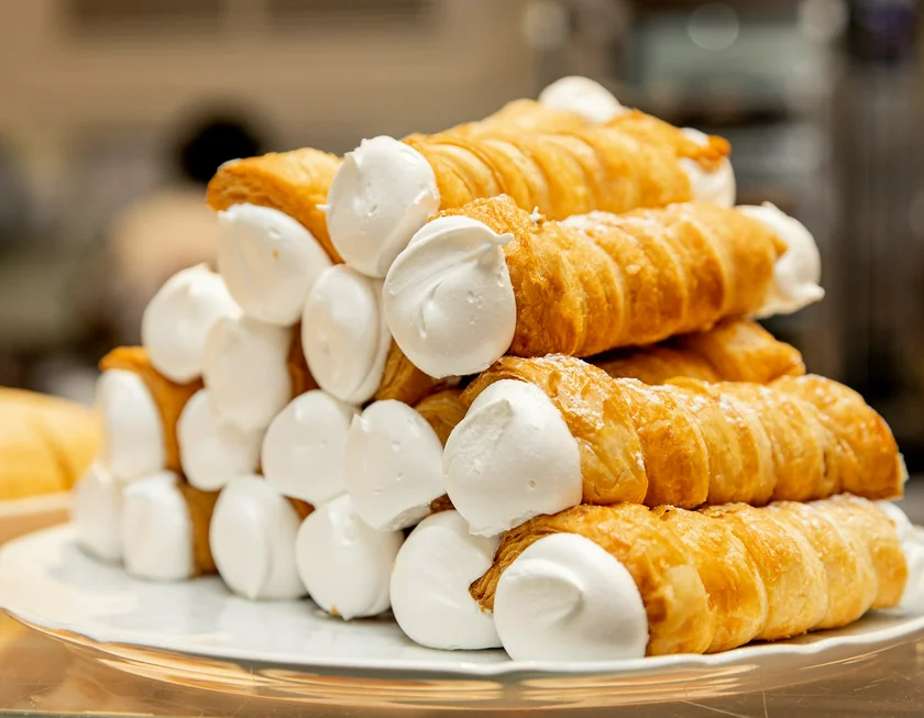Kremrole, also known as cream rolls, is a delicious pastry made with puff pastry dough, the same dough used to make strudel. The dough is shaped into tubes using a mold, then baked and filled with a light and fluffy mixture of beaten egg whites. The pastry is finished with a sprinkle of sugar, adding just the right amount of sweetness. The result is a delicate and flaky, melt-in-your-mouth flavor.