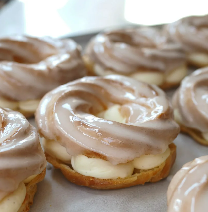 It's easy to confuse a věneček with a větrník because of their resemblance. Both are made of choux pastry; however, the věneček has a hole in the middle and is sealed with yolk cream, giving it a different texture than the pinwheel. Additionally, the wreath is smaller than the větrník, and it is typically covered with classic fondant.