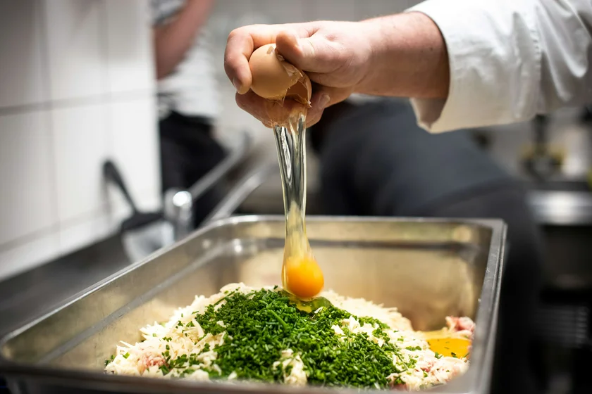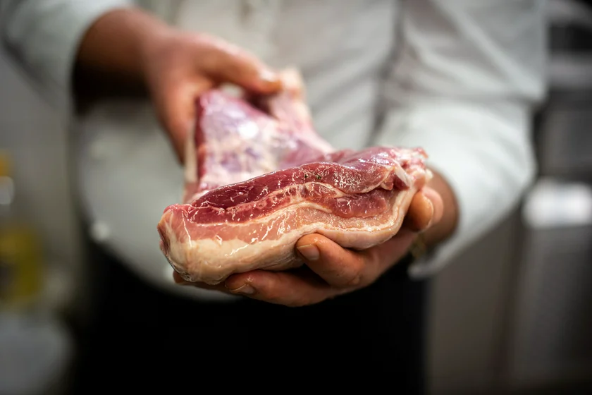 "The meat must contain fat so that the schnitzel is juicy," he explains. For the best results, he removes the skin from the pork belly and cuts it into medium-sized cubes before grinding with a medium-blade attachment.
