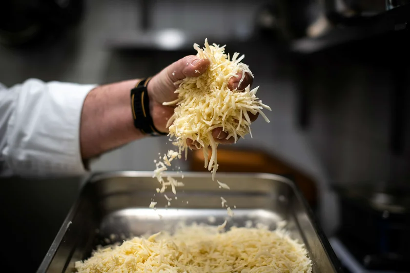 "At Lokál we use an aged Eidam cheese. You can also use gouda, but in my opinion, an Eidam-style cheese works best for the fritters," says the chef. Tempted to add the cheese straight to the grinder with the meat? Stop! The cheese will become ground up into the meat and won't have the desired stretchy effect when cut. Shred cheese coarsely on a box grater and add to the ground meat mixture.