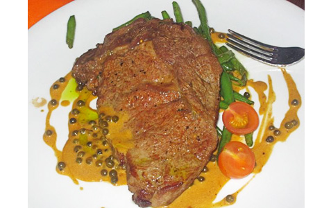 There was no “Douglas Sirk” steak on the menu as there is in the movie. I ordered the closest thing, which was the rib eye with peppercorn sauce and green beans (229 CZK).