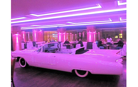 On the second level, another Cadillac, sitting under the harsh, purple-pink lighting, dominated the room.