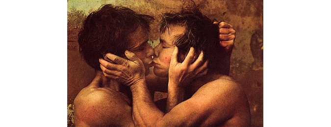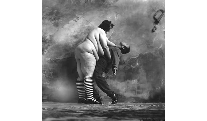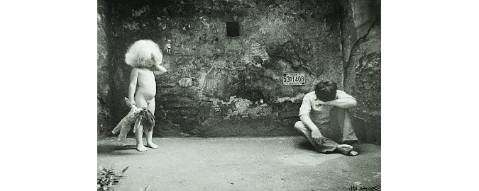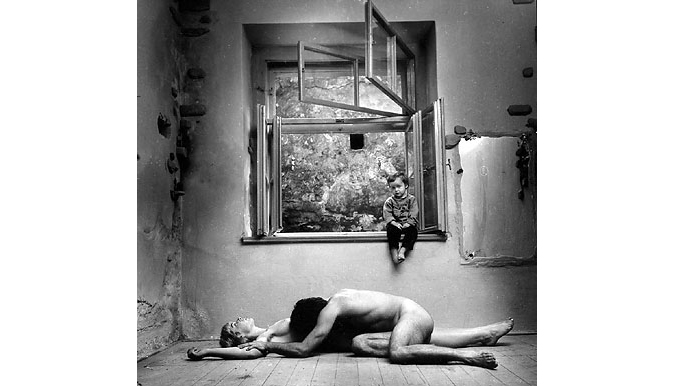 Jan Saudek is most well-known for scenes with nude or semi-nude figures – ordinary people – against a backdrop of bare plaster walls or painted backdrops, which appear repeatedly in his works. Other backdrops include cloudy skies or Charles Bridge. In many works he adds tints to colours, giving the images a dreamy feel. Many earlier works, from the 1960s, are in black and white and have a different, more naturalistic feel. Recurring themes feature strongly in Saudek’s work, for example childhood, and the relationship between men and women. He also uses the same models over again in his photography.