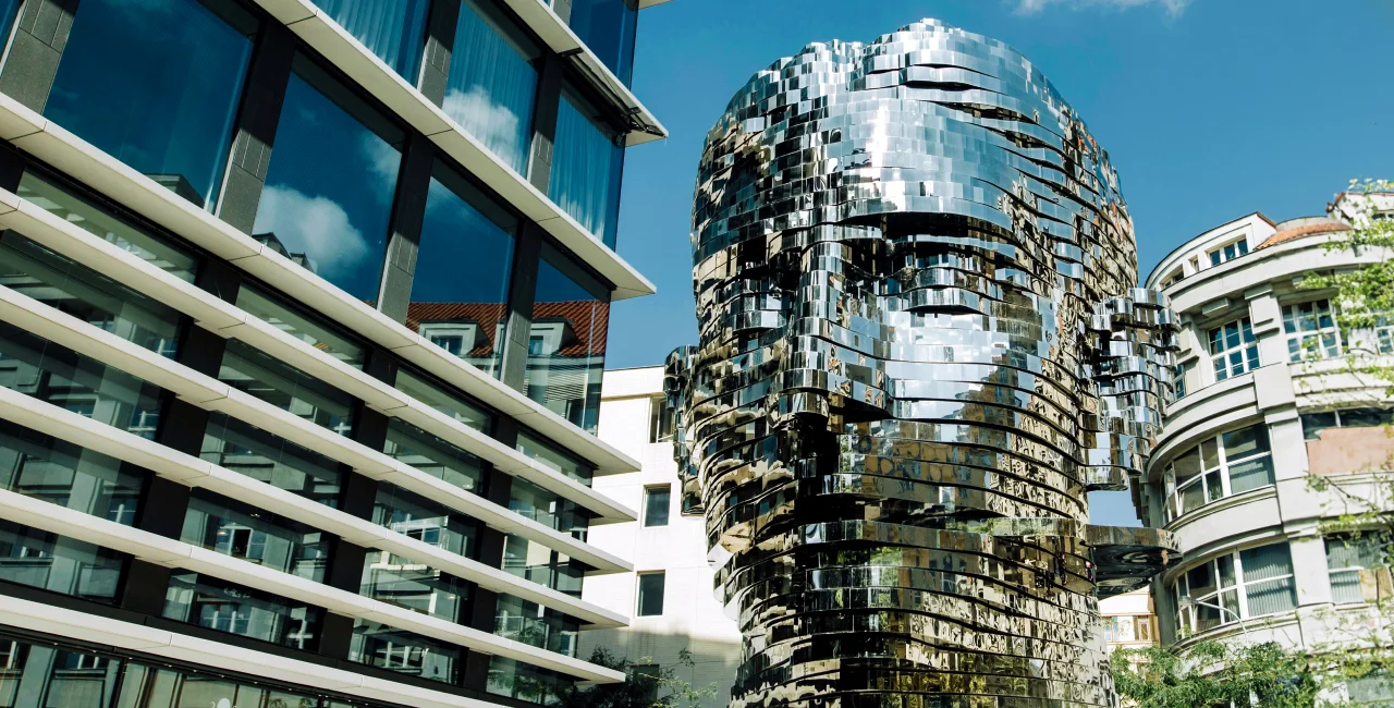 In recent years, perhaps the most prominent emblem of Kafka in Prague has been a modern sculpture of the writer’s head, a whirling steel wonder installed by Czech artist David Černý outside the Quadrio shopping center.