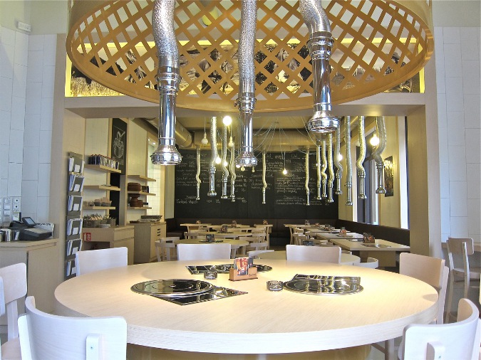 But the most interesting aspect of the design is the tables with built-in gas grills, each with its own silver ventilation system descending from the ceiling.