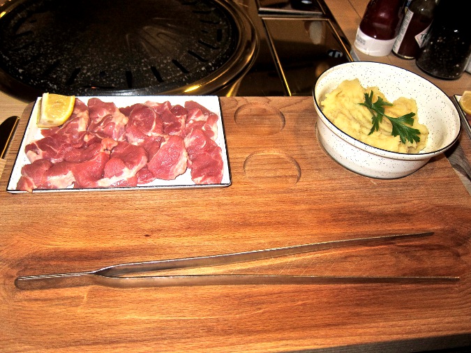 The waitress pulled down the exhaust vent, fired up the gas grill and set the flame to high. I got 200 grams of pork neck (200 CZK) with a side of potato puree with truffle oil (70 CZK).