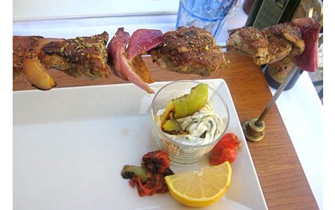 In between the meat were grilled red onions and green peppers. Underneath, there was a great tzaziki-like yogurt mixed with fresh, chopped mint.