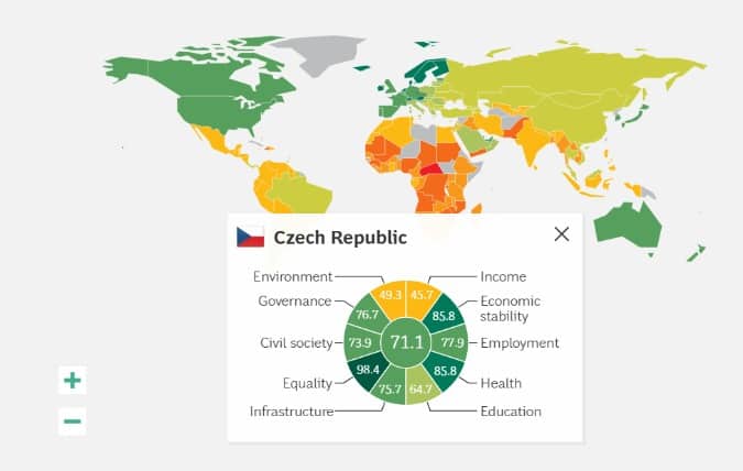 Publicly available data was used to compile the rankings which landed the Czech Republic in the 25th position with a score of 71.1 percent, scoring well in the criteria of equality (income or access to education), economic stability and the quality of health care – negatives were the relatively lower level of earnings (assets) and the quality of the environment.