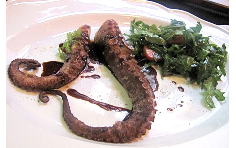 For her main course, V ordered the grilled octopus (425 CZK). It came with a Chianti wine reduction and a rucola salad.