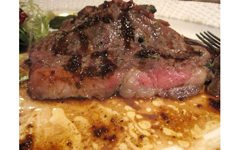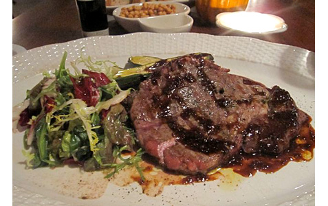 The beef itself was quite different from an American rib eye. The thin cut, cooked medium-rare, was certainly tender, with a healthy marbling of fat in the middle. But the flesh had more of a firmness or denseness to it.
