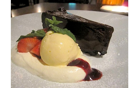 The chocolate in the cake was rich, intense, and very fudgy. It was surrounded by fresh whipped cream, strawberries, and vanilla ice cream that didn’t impress me.