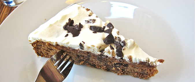 The dense, moist slice was studded with dark chocolate and infused with the essence of the sweet almond liqueur. It was topped with fresh cream.