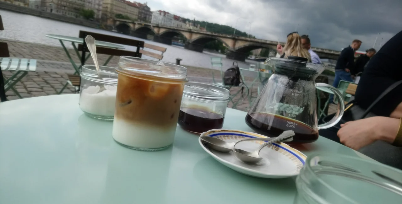 Customers have a portrait view of the west bank of the Vltava. Swans gather and rowers skim along the waterway under an open sky. It’s an ideal location for people watching.