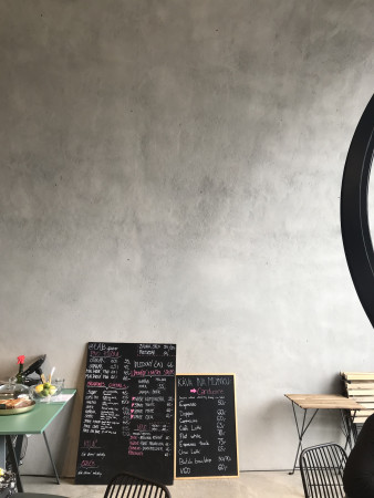 The ambiance of the cafe is sterile concrete minimalism. There is no art on the walls, no greenery, and nothing soft about the decor. A black bar is the focal point of the indoor space, rising to chest level with glass beer mugs stacked two-deep and a blank wall beyond. Minimal storage reveals the visual clutter of cleaning supplies and overloaded electrical outlets. We did not see a restroom on the premises.