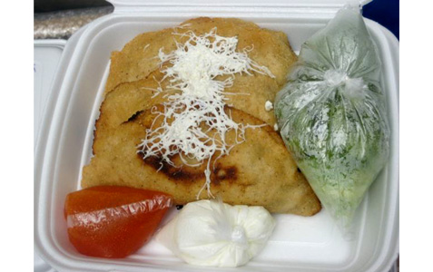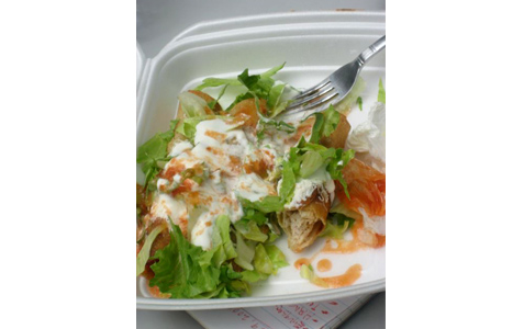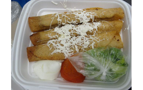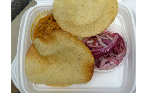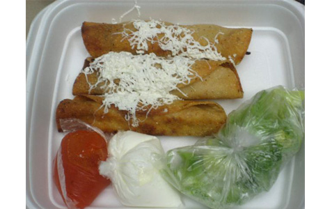 PB was not enamored. He thought the tortillas were on the greasy side. The menu said they were filled with a stewed chicken made with a special recipe, but he thought it needed seasoning. It had the same bagged fixin’s on the side.