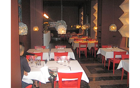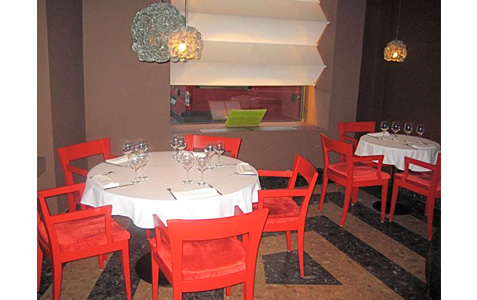 Brown and beige walls stand in stark contrast to red chairs and white table cloths.