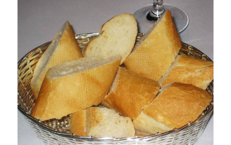 We receive a bread basket filled with fresh baguette slices.