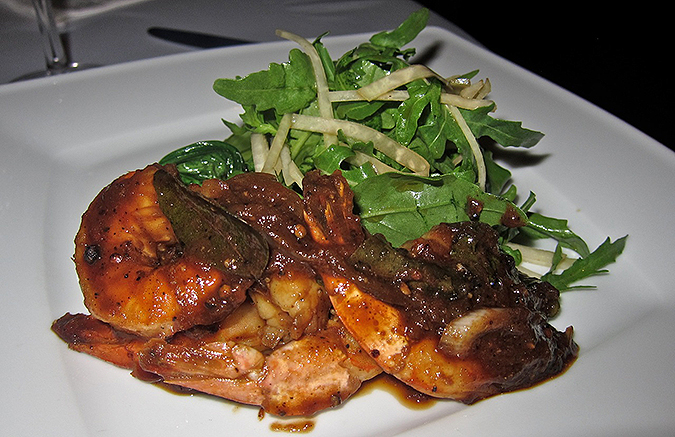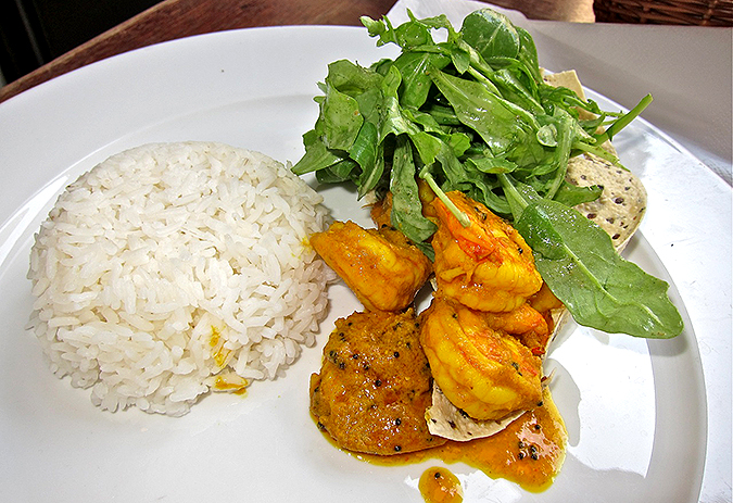 Six small crustaceans were served cool, with a small portion of rice, papadums, and salad. The prawns were on the chewy side with mild heat and the flavor of curry and mustard seed. I wasn’t impressed.