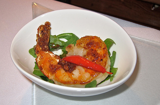 Course 4: Butter Prawns. This is a picture from the first tasting. At the second, I received two. These are wok-fried with red chillies, curry leaves, garlic, rice wine, and rocket leaves.