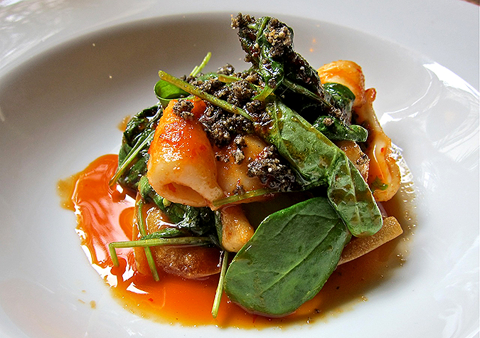 What grabs your attention is the homemade, caramelized chili sauce. After you get past the sweetness (and not everyone will), you taste lime leaf along with black and white sesame praline mixed in. There’s a slow-building but serious spiciness. I wished it was bigger, but I liked it.