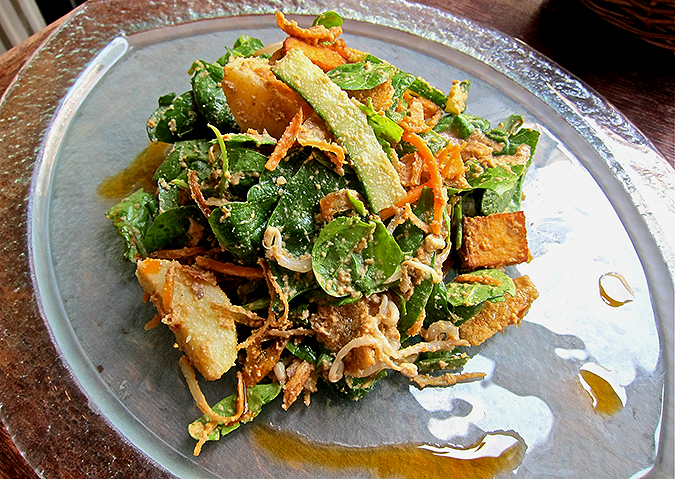 I’ve had many versions of this Indonesian salad in Netherlands, the USA, and even in Prague. Spinach is tossed with a peanut dressing, shredded carrots, warm crispy tofu, cassava crisps, and potato slices.