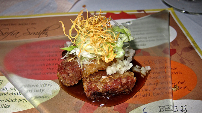 Course 5: Crab. A soft-shell crab is deep-fried and lightly coated with a Singapore black pepper sauce with green chillies.