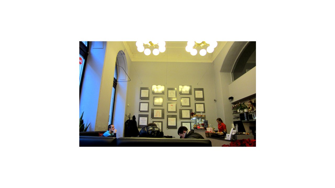 Leica Gallery’s café is one of Prague’s best kept secrets. I am continuously surprised when I invite friends to meet me and I receive the response “Where is Leica café? I’ve never heard of it before.” I originally discovered it by taking a wrong turn down Školská about a year and a half ago and have returned several times since. What makes this café unique is its hybrid concept and stunning architecture. Leica is part gallery, part café, and part bookstore, which means there is no getting bored in this place. You can enjoy a drink or food, browse its rotating photo exhibits or gawk at their extensive photography book collection (which is for sale). Once you push through the massive front door, you can’t help but feel dwarfed by the café’s striking ceiling height or captivated by all the little details surrounding its window frames and ceiling.