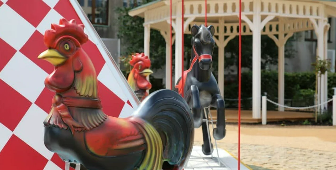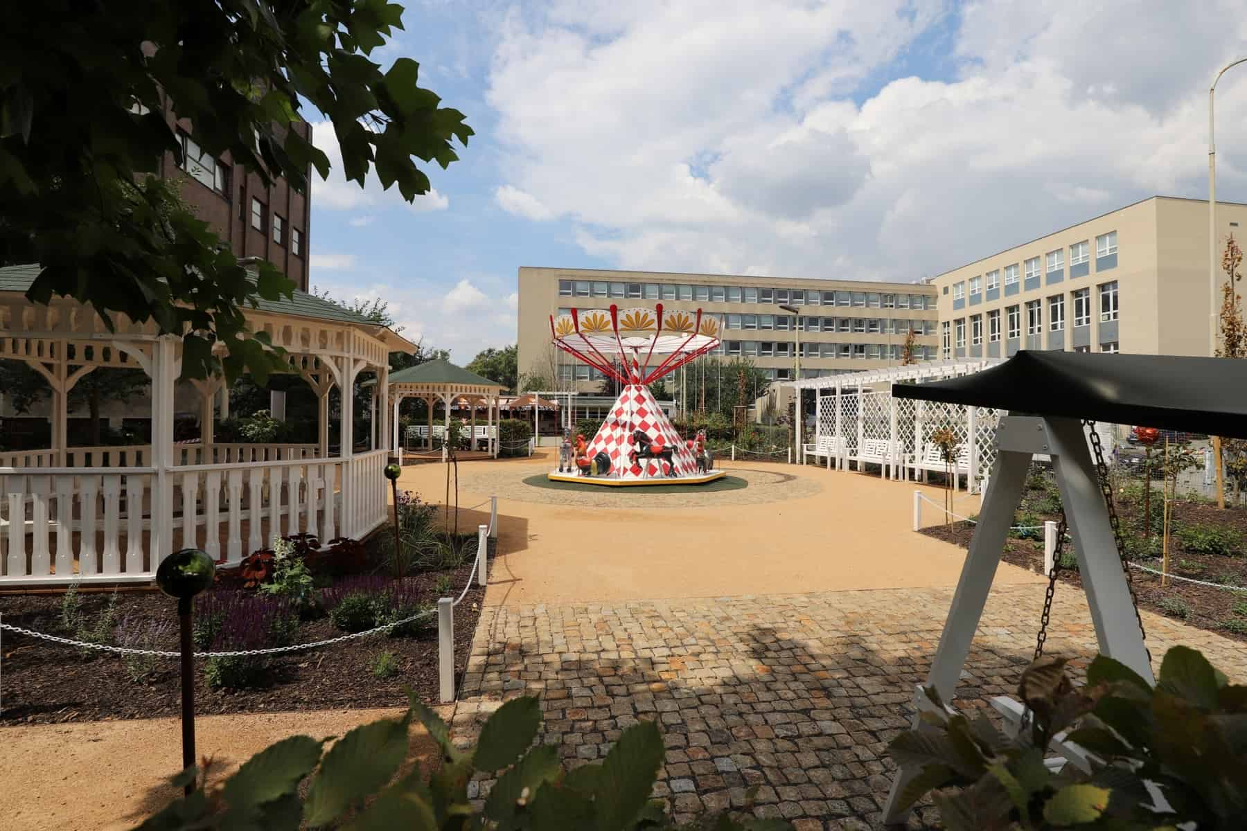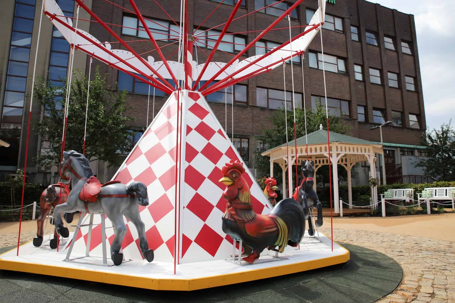 For the smallest visitors, a historic carousel with animal motifs and a swing awaits amid the flower garden.