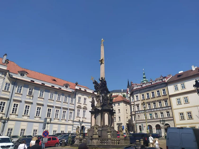 - The tour started by the Holy Trinity Column in the upper part of Malostranské náměstí, ventured into Hradčany, ended at the Café Club Míšeňská, and included more than a dozen stops. The size of the group was around 15 people.