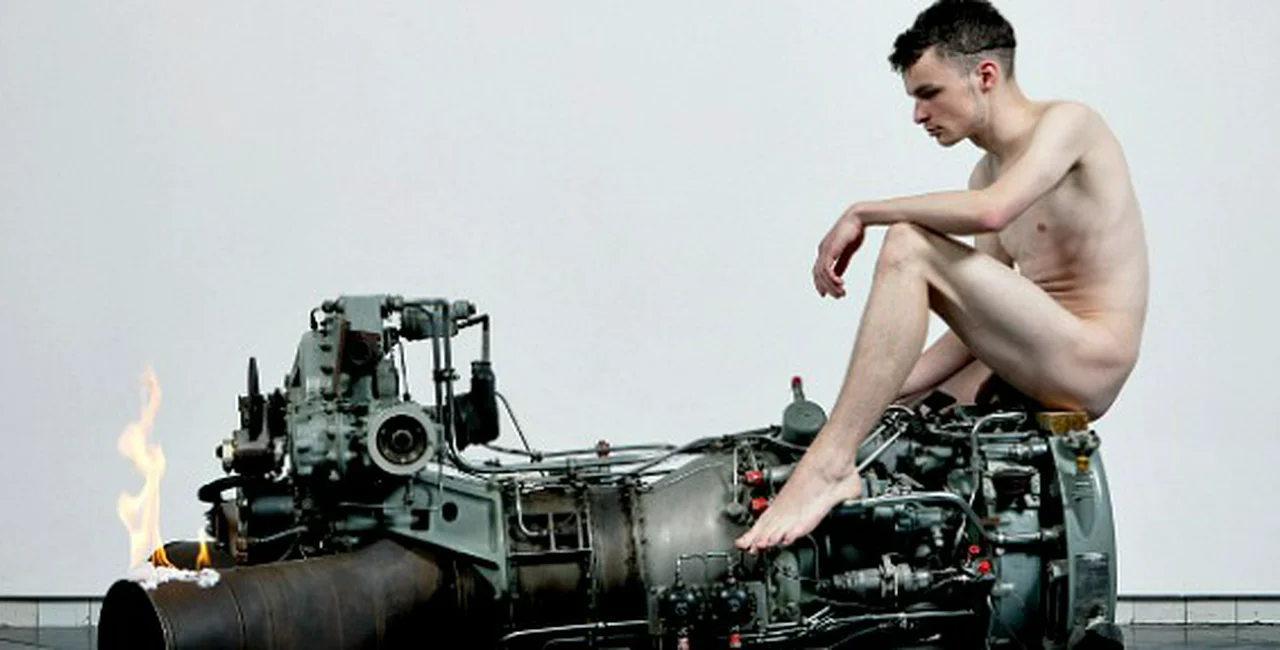 But the most striking elements of the exhibition are the naked young men who accompany some of the art pieces.