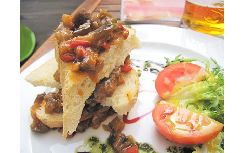 I liked it a lot. It was more salty than tart, but the flavors of the cooked red, yellow, and green peppers, mixed with the eggplant, balanced it out well. The bread also soaked up the good pesto and balsamic vinegar that swirled on the plate.