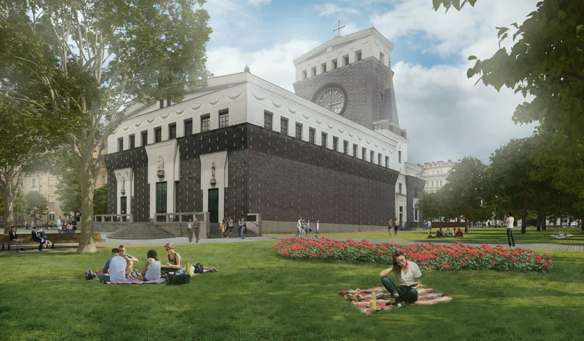 The main attraction on the square will remain the Church of the Most Sacred Heart (Kostel Nejsvětějšího Srdce Páně), designed by Slovenian architect Jože Plečnik and built in 1929–32. Its facade has just undergone a renovation.