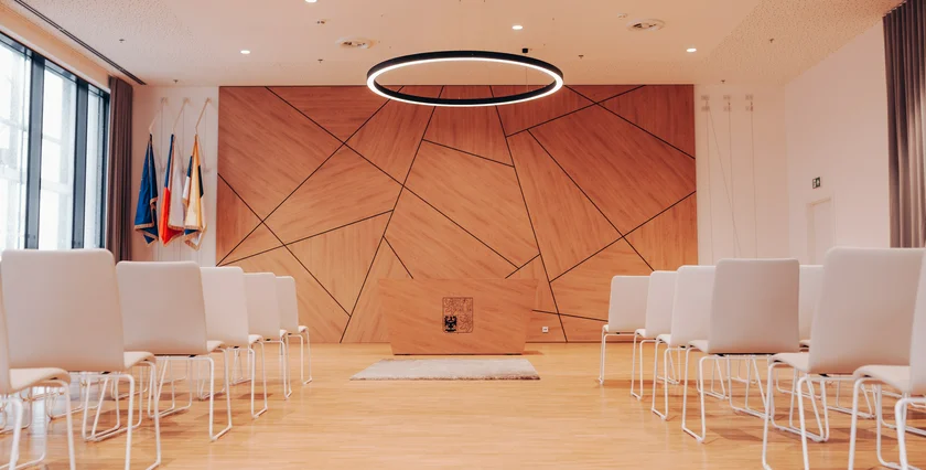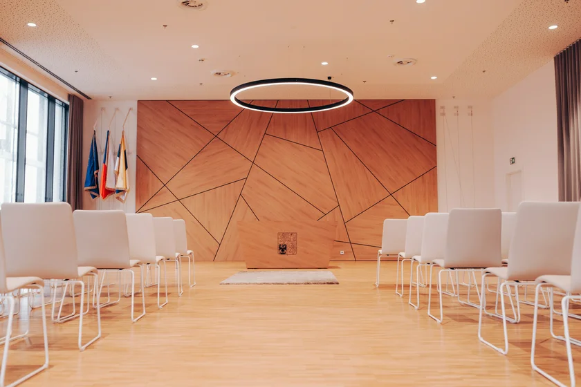 The cubes are arranged longitudinally along General Šiška Street, presenting a compositionally simple yet coherent architectural footprint. Functionally, the frontmost cube carries a newly built ceremonial hall.