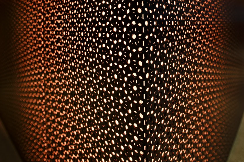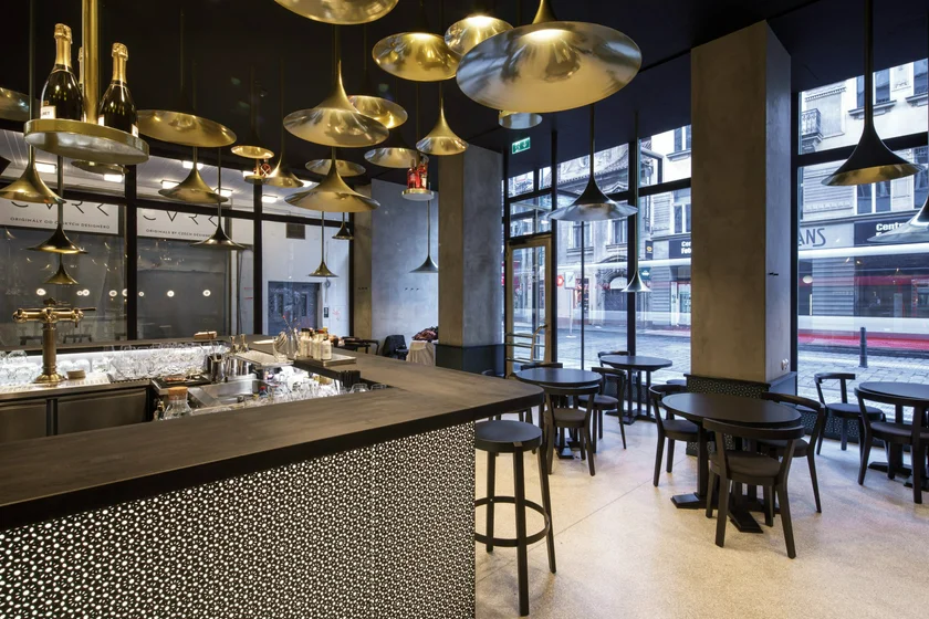 The new space’s interior is the work of Czech design innovators. The main attraction, an LED-panel bar, changes colors dynamically throughout the day. It's the work of design duo Spectoda, who have previously crafted everything from chandeliers made from waste hoses to light shows for Prague Pride. Statement gold light fixtures resembling vintage phonographs accent the minimalist black tables.