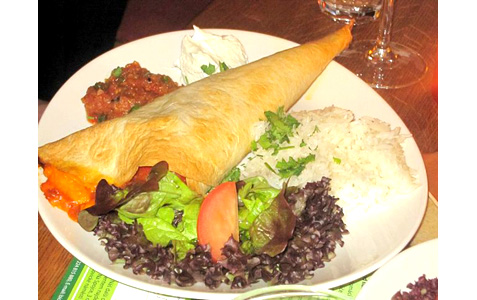 For a main course, V had the red bean chili baked with cheddar in a flour tortilla, rice, tomato salsa, sour cream and fresh coriander (145 CZK).