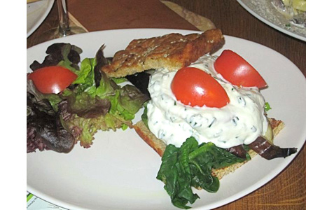 I ordered the grilled goat cheese, spinach, eggplant, tomatoes and chive spread, served burger-style in a freshly baked focaccia (145 CZK).