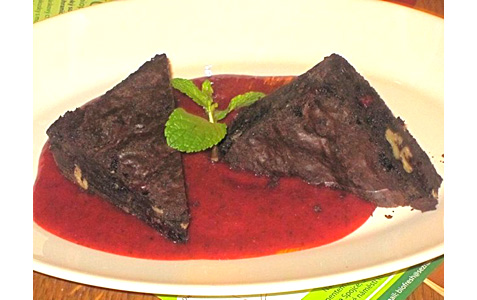 I ordered homemade brownie with walnuts and cranberries, served with strawberry-mint sauce (65 CZK).