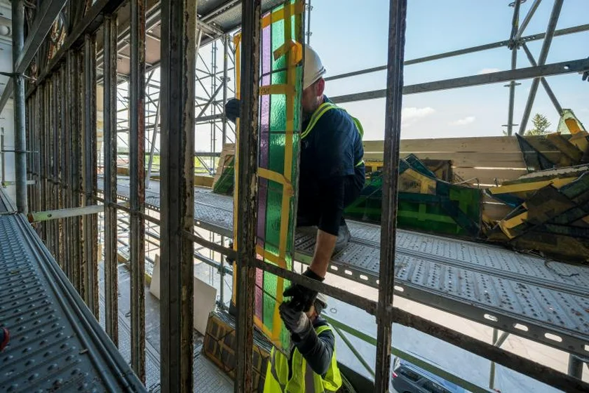 The restorers will remove, clean, and place each glass piece in new support frames. Some glass will need to be replaced – especially on the west wall of the middle pavilion. During the 2008 fire, they were irreversibly damaged by extreme heat.