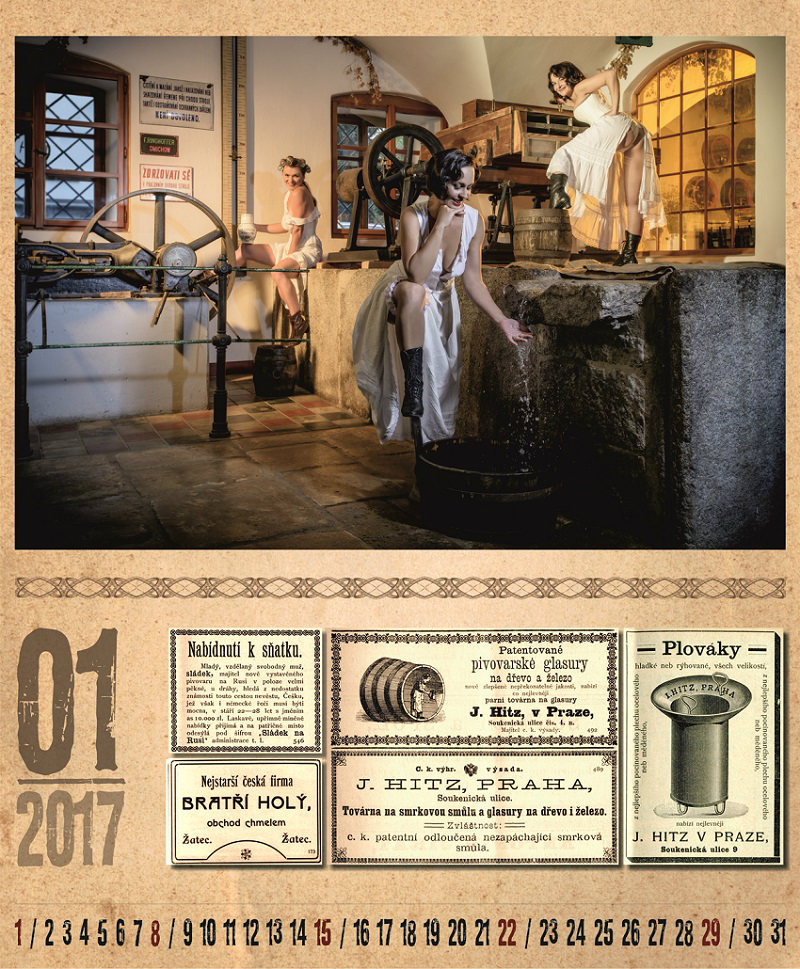 Produced by the historic Černokostelecký Brewery, the new calendar features gals in nineteenth-century garb manning the brewery’s machinery.