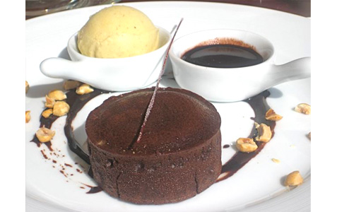 I ordered the Moelleux chocolat with vanilla ice cream (98 CZK). The warm, perfectly formed cake also came with a dish of chocolate sauce.