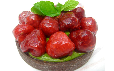 The berries sat on a green tea cream, held by a chocolate nut crust.
