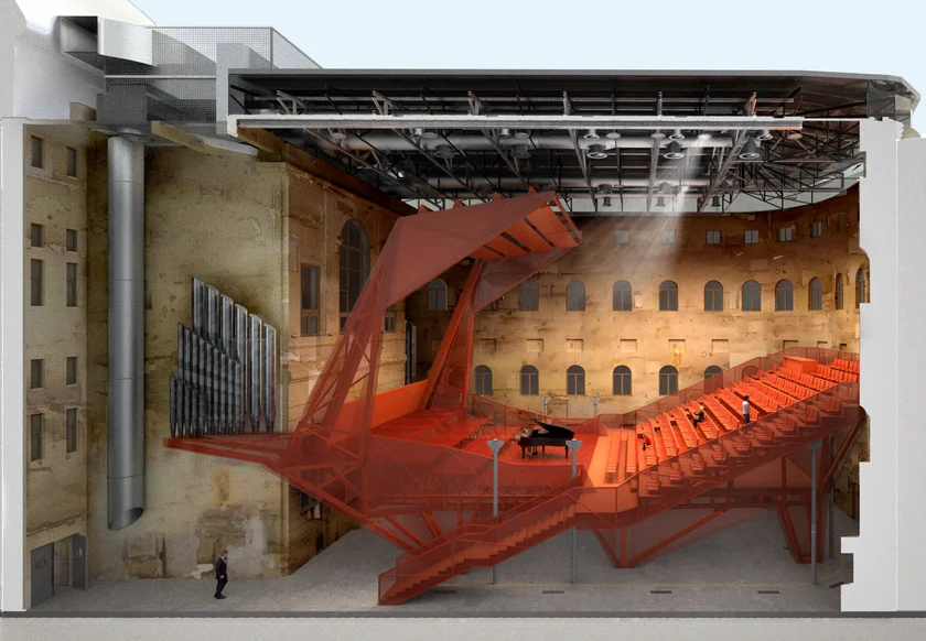 The acoustic properties of the built-in hall are also unique. The stage is equipped with a sliding acoustic wall and adjustable rotating panels that can adapt the space to various sound requirements.