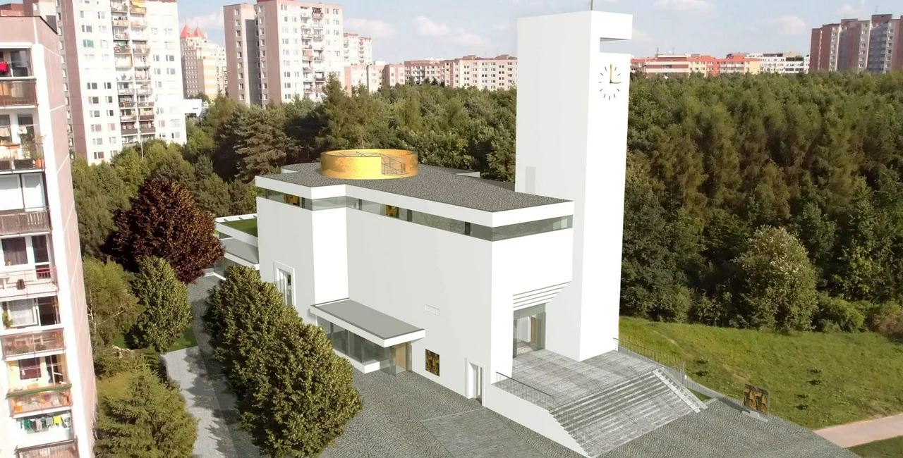 The church building has simple geometric shapes and white walls, matching the prefab houses in its surroundings. It is situated close to a forest and the Prokopské údolí valley, a popular walking destination for Praguers.