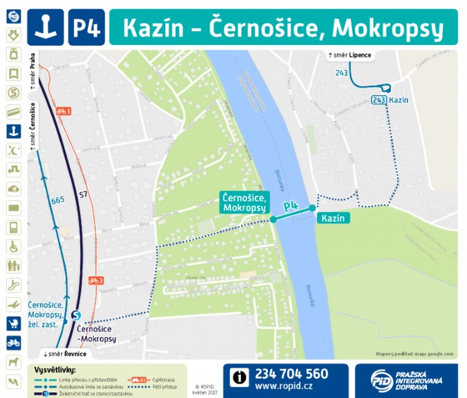 The ferry departs from the Kazín wharf, approximately 450 meters from the 243 bus line and cruises towards Černošice- Mokropsy, located 600 meters from the railway station Černošice-Mokropsy which operates on line S7.