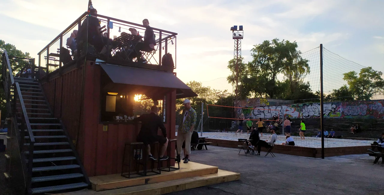 A sports ground next to the building has long been all but abandoned. Now, in addition to a refreshment stand and seating, there is a beach volleyball court and two ping pong tables. There are also board games that can be borrowed.