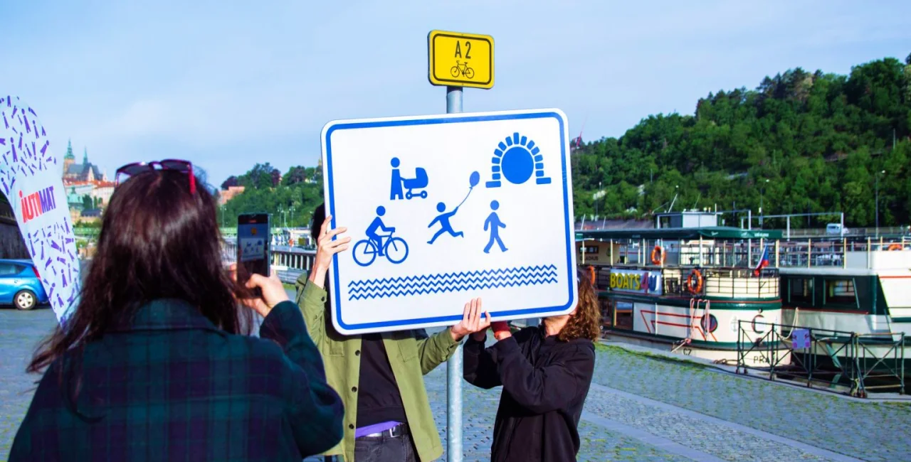 The newly installed signs, designed by illustrator Filip Zatloukal, bear the slogan “Náplavka: We all belong here” and are intended to reinforce the message of mutual respect. The signs, roughly the size of residential zone markers, supplement existing “Behave respectfully” signs and form part of a broader awareness campaign, including an animated video and other on-site materials.