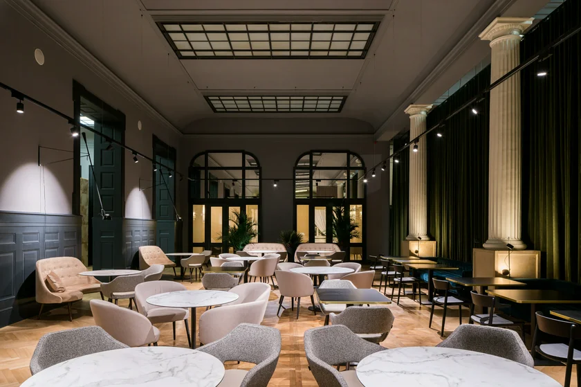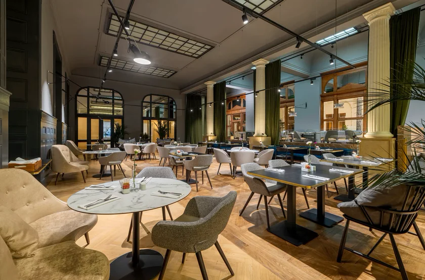 The Vault, a lovely wood-paneled bar discreetly tucked off the lobby entrance, was the original First Czech Land Mortgage Bank vault. The space, which features a photographic exhibition celebrating the building’s history, can be rented for private events such as wine or spirit tasting, intimate birthday celebrations, think tank meetings, or product launches.